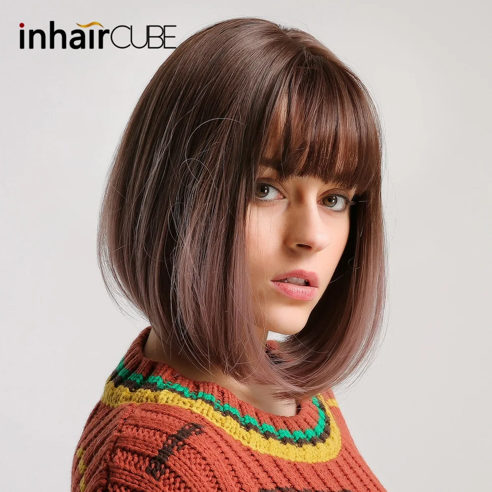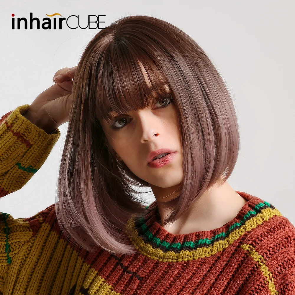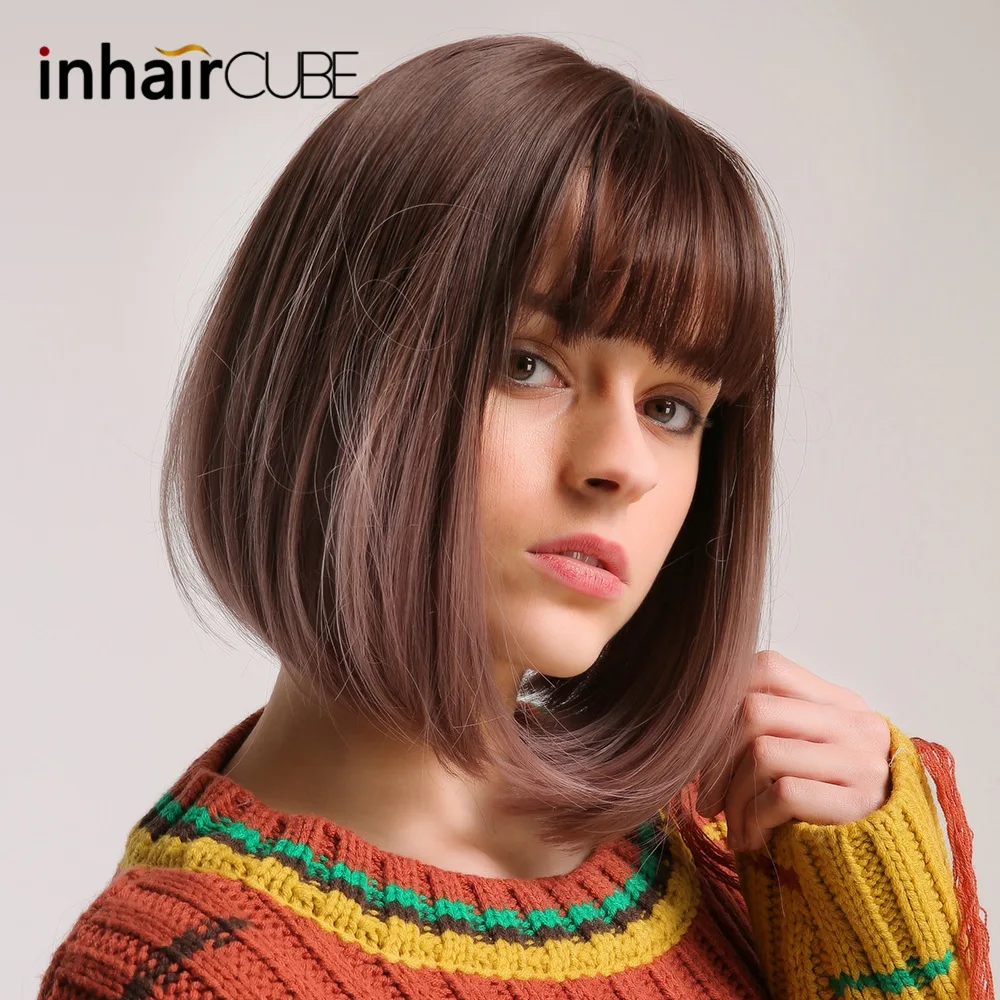 Inhaircube Bobo Straight Ombre Hair Synthetic Wigs with Bangs Heat Resistant Brown Purple Light Gol